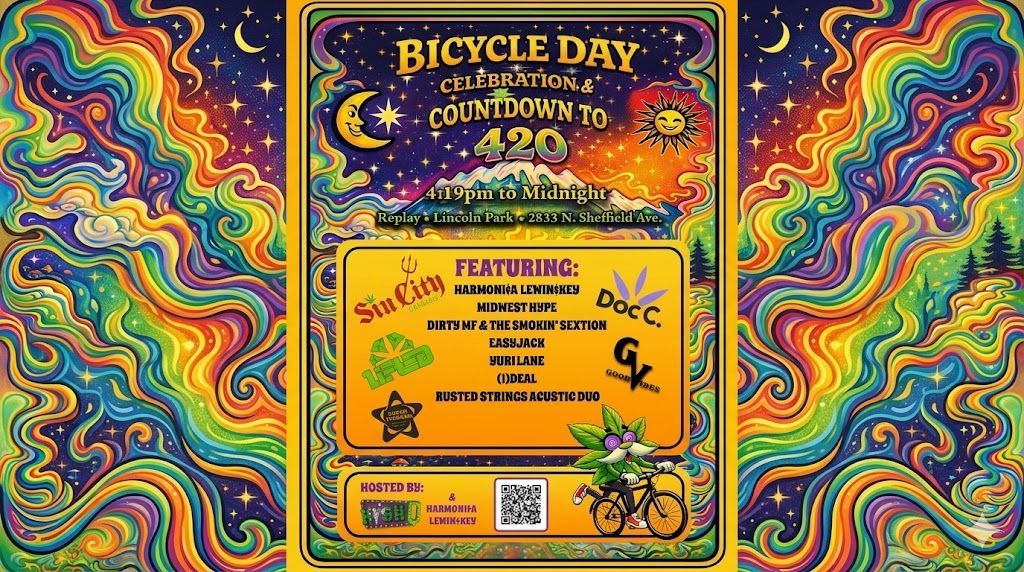 HARMONI¢A LEWIN$KEY and the producers of HighQ – America’s Favorite Drug Test will host a psychedelic-inspired Bicycle Day Celebration at Replay Lincoln Park , highlighting music, art, and creative culture and culminating in a New Year’s Eve–style midnight countdown to 4/20. Guests can explore free-to-play vintage arcade games, participate in themed activities inside the HighQ Lounge, and experience an evening designed to blend entertainment, community, and immersive experiences. The event will feature live performances from HARMONI¢A LEWIN$KEY, Midwest Hype, Easyjack, Dirty MF & The Smokin’ Sextion, Yuri Lane, (I)deal, and Rusted Strings Acoustic Duo. Craft beers and cocktails will be available throughout the night, with re-entry permitted for attendees. Sponsors supporting the celebration include Sin City Cannabis, Lifted Microgrowery, Good Vibes Vapes, and Doctor C Brand.
